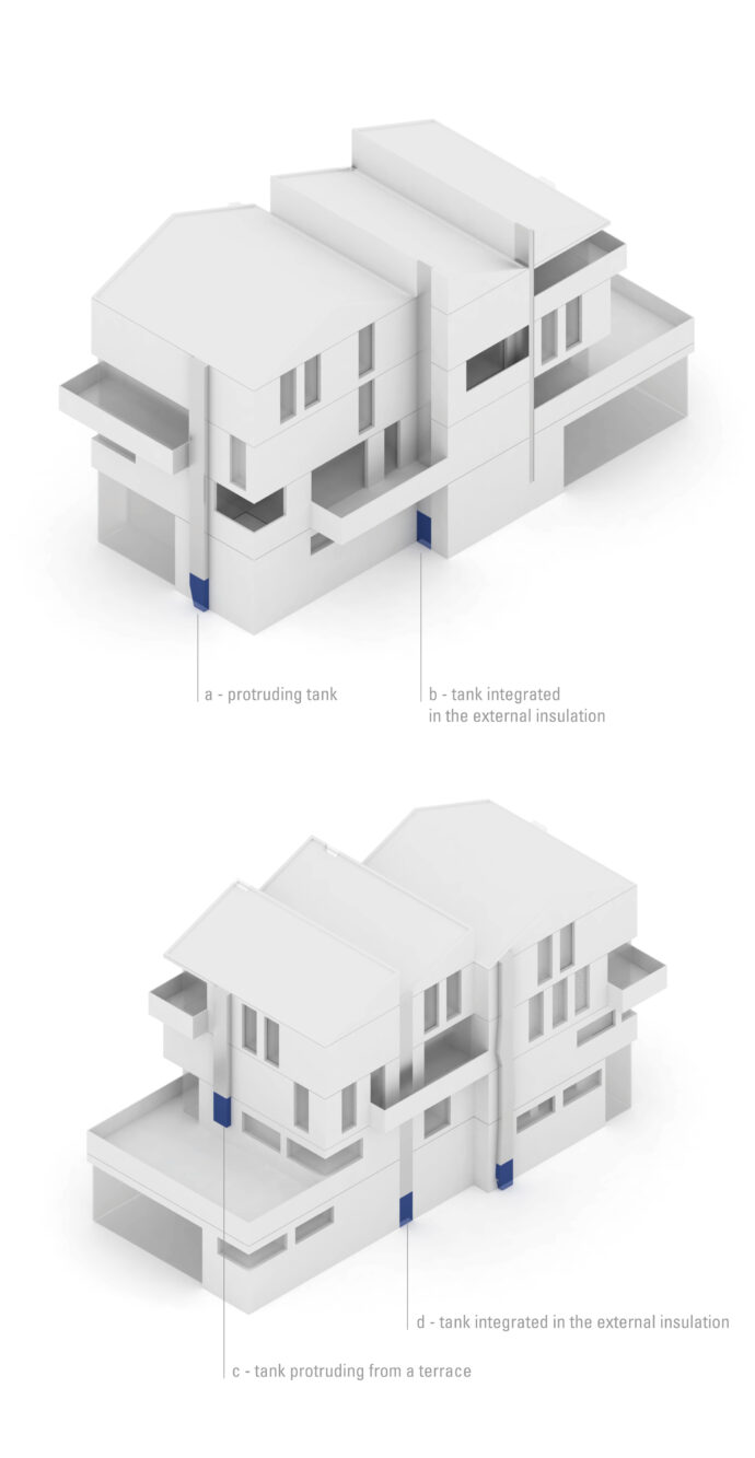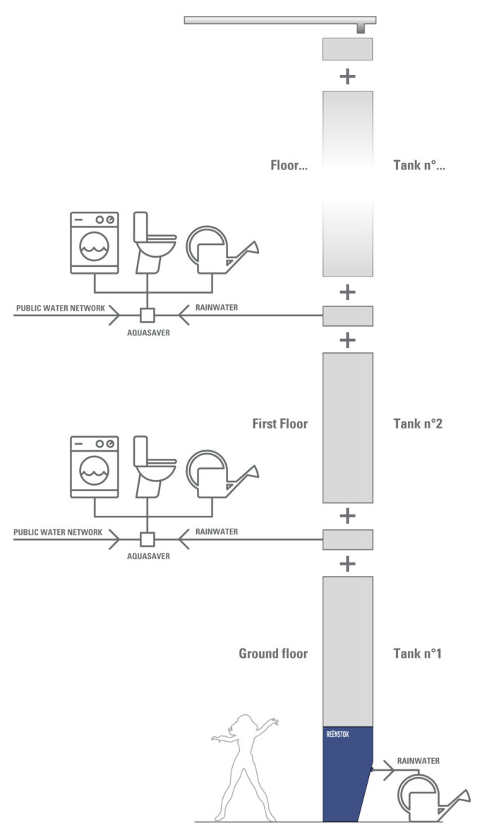 Reënstok is a facade tank that replaces a downspout. Rainwater, stored in these buffer tanks, no longer goes directly to the sewers. Water is collected and stored for in situ recovery: watering balconies, gardens at the foot of the building. The use of rainwater is also possible, on each floor, to supply the toilets, the washing machine in addition to the public network. This buffer device also has another advantage: that of a regulator, by absorbing excess water in the event of a storm to prevent overflows from the treatment plants and by ensuring the flow necessary for the proper functioning of the sewers in dry periods. à supprimer Composed of modules, this tank is erected without height limit up to the roof. This system purges itself automatically in the event of severe frost.