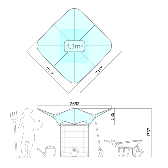 It is a funnel roof of 4.3m2 which is fixed on an IBC 1000×1200 type water tanker.