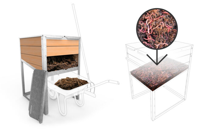 Dissocié du sol, ces composteurs fonctionnent grâce à une table d’ensemencement que vous devrez préalablement « nourrir » par quelques pelletées de sol vivant : micro-organismes, vers… indispensables au processus de compostage.