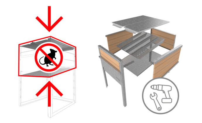 Une solution innovante de compostage pensée sur pieds afin de faciliter le vidage du compost par brouette ou d’autres contenants.