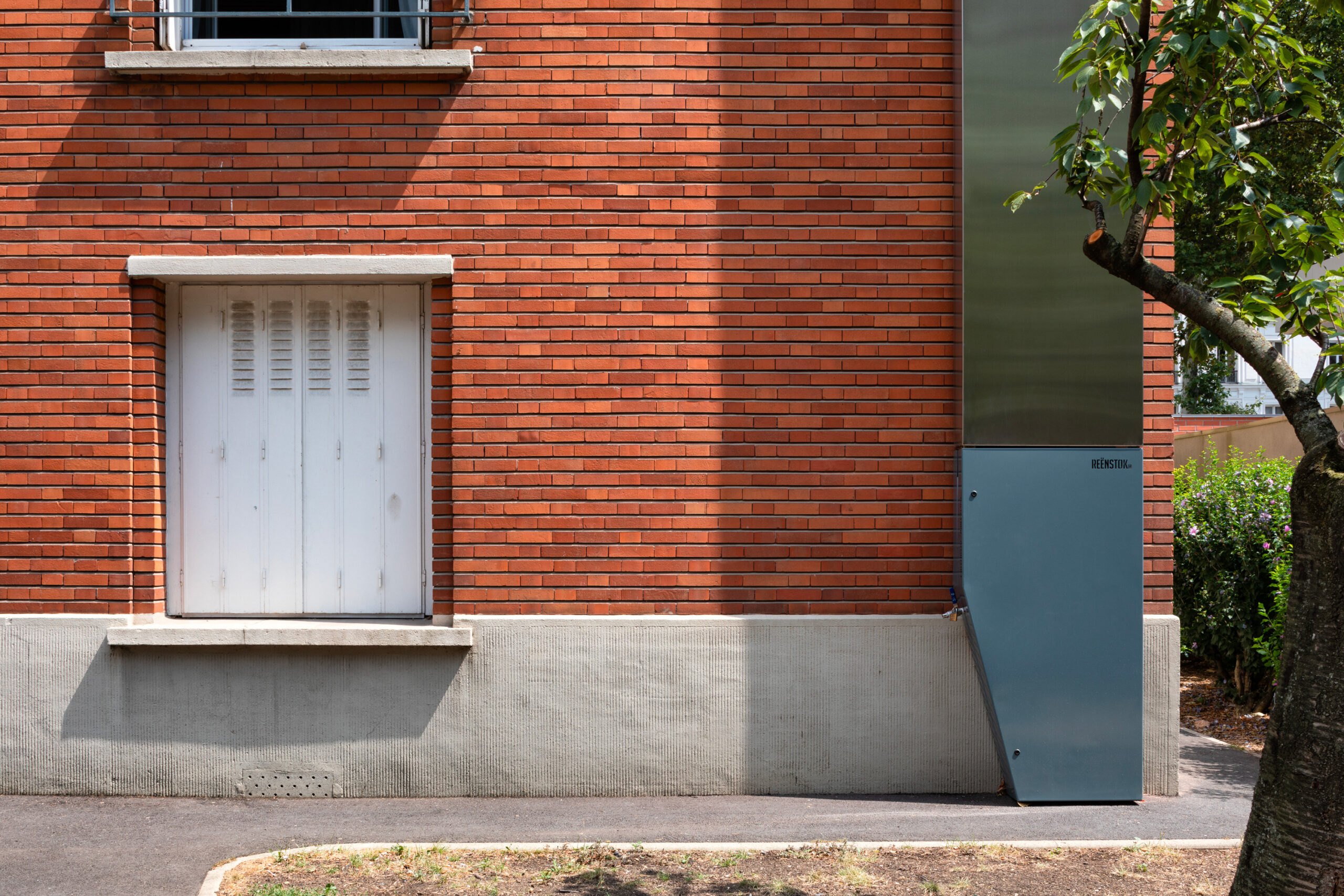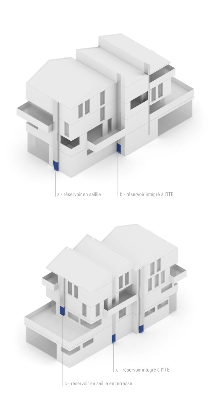 Reënstok est un réservoir de façade qui se substitue à une descente d’eau pluviale. L’eau de pluie, stockée dans ces citernes-tampons ne rejoint plus directement les égouts. L’eau est collectée et stockée pour une valorisation in situ : arrosage des balcons, des jardins en pied d’immeuble. L’utilisation de l’eau pluviale est aussi possible, à chaque étage, pour alimenter les toilettes, le lave-linge en complément du réseau public. Ce dispositif tampon a également un autre intérêt : celui de régulateur, en absorbant les surplus d’eau en cas d’orage. Il permet ainsi d’éviter les débordements des stations d’épuration et en assurant un écoulement nécessaire au bon fonctionnement des égouts dans les périodes sèches. Composé de modules, ce réservoir s’érige sans limite de hauteur jusqu’à la toiture. Ce système se purge automatiquement en cas de fortes gelées.