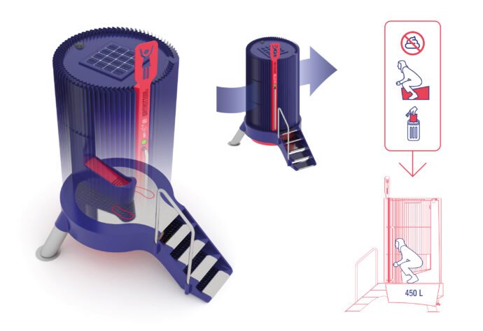 L’uritrottoir féminin est conçu sur pilotis. Il ne nécessite aucun raccordement au réseau. Il se pose en toute simplicité dans l’espace public. Cette surélévation permet d’y glisser un réservoir de 450 litres destiné à la collecte des urines. C’est une solution low-tech et robuste. Pour des questions de sécurité et d’intimité, il est doté d’une cabine verrouillable. Une signalétique spécifie le genre : féminin, et la fonction : uriner, fèces interdites. Pour assurer une propreté optimale, l’intérieur est conçu en acier inoxydable. La forme de l’urinoir est conçue pour uriner en squat et ainsi éviter tout contact. La ventilation naturelle de la cabine est assurée par une succession d’ailettes constituantes de l’habitacle. Équipé d’une sonde connectée, le gestionnaire peut contrôler à distance le remplissage du réservoir et vidanger le réservoir dans les temps. Ce projet s’inscrit dans une logique d’économie circulaire. Une fois pompées, les urines, riches en azote et phosphore, peuvent être valorisées en fertilisant.